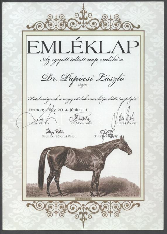 Lovas emléklap aláírásokkal: Lázár Vilmos és Zoltán fogathajó világbajnokok, dr. Papócs László (1939-2015) állatorvos, egyetemi tanár, dr. Móré Attiila ,az Alphavet állatgyógyászati zrt tulajdonosa, Prof. dr. Sótonyi Péter akadémikus, dékán, stb, prof.dr. Fehér Károly a Magyar Lovassport Szövetség igazgatója 20x30 cm