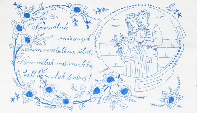 Kézzel hímzett konyhai falvédő, "Nem adlak másnak, nekem rendelt az élet, nem adlak másnak, ha kell, harcolok érted!" felirattal, 45x76 cm