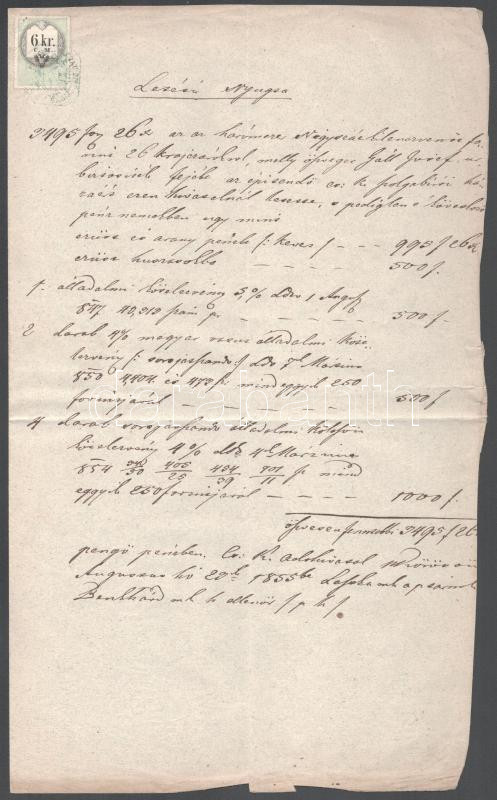 1855 Nyugta 6kr illetékbélyeggel