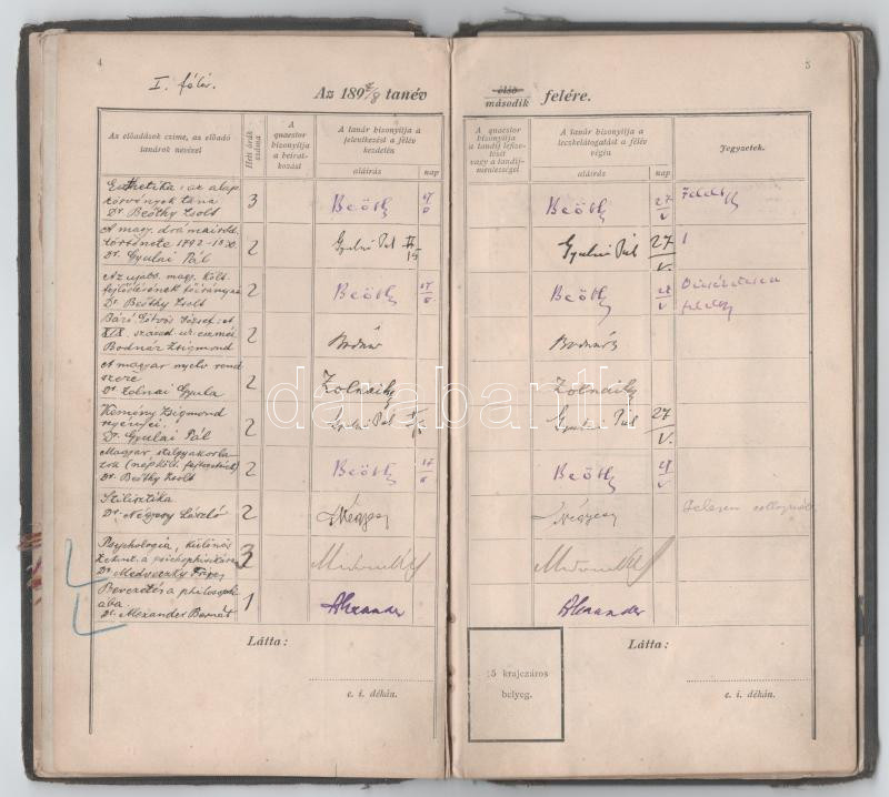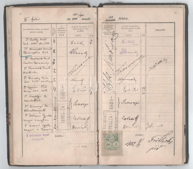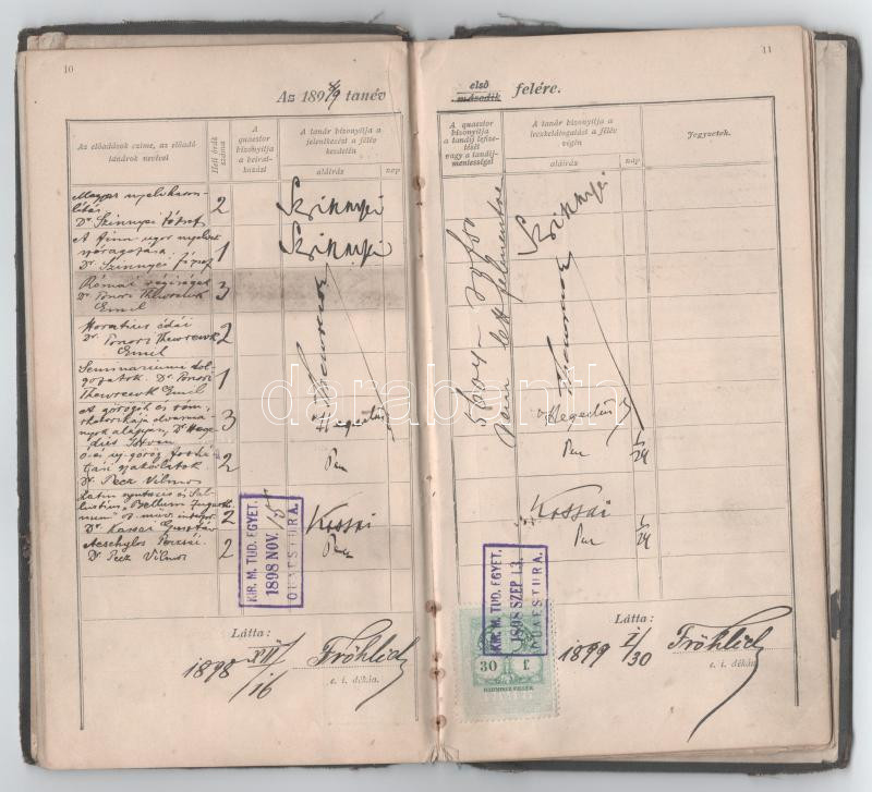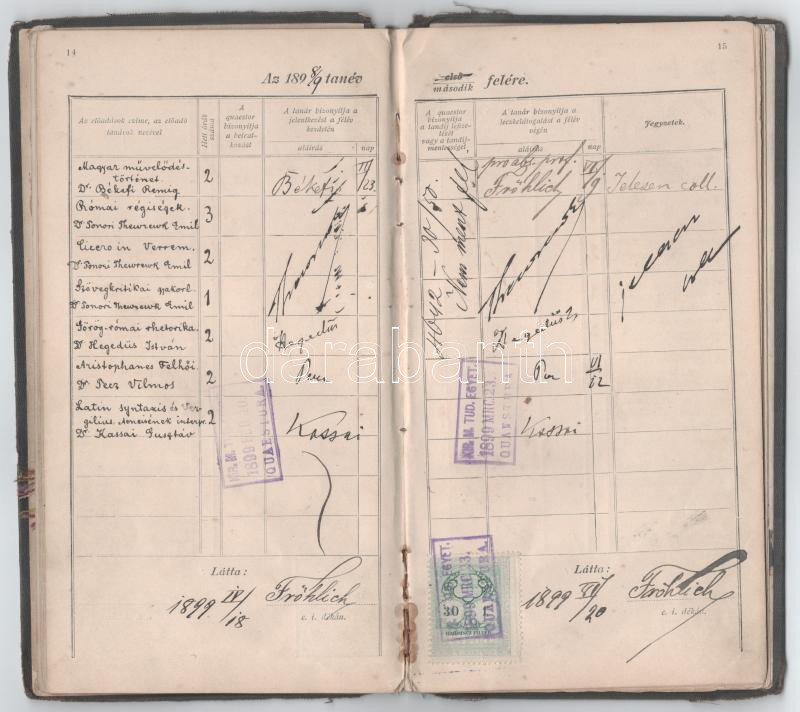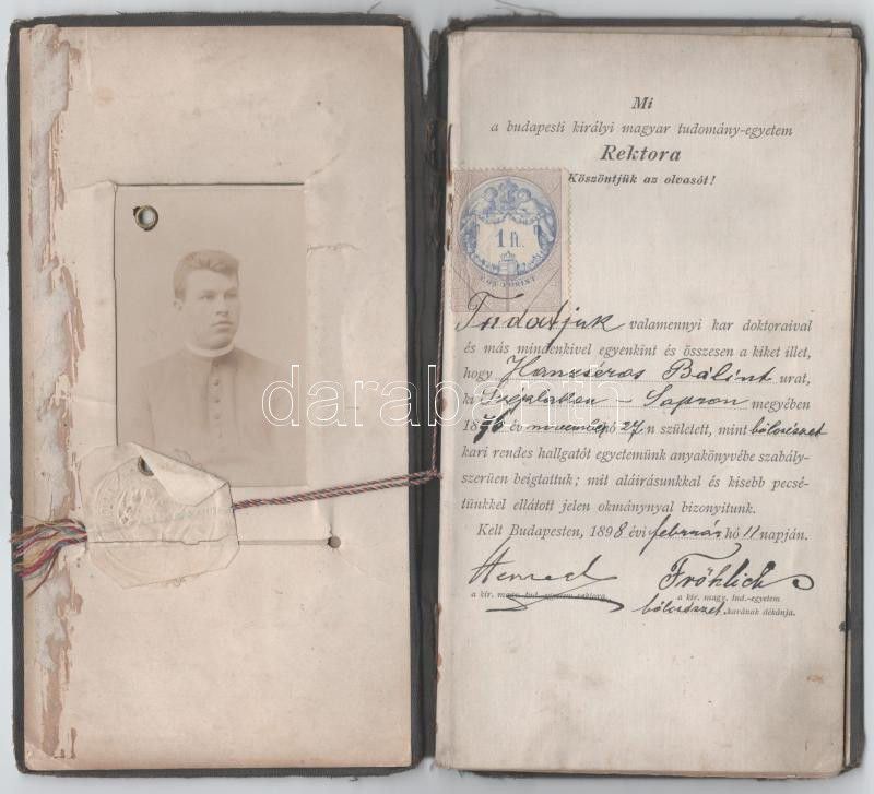 1898 Bp., a Budapesti Kir. M. Tudományegyetem leckekönyve Hanzséros Bálint bölcsészhallgató részére, számos aláírással, köztük Herczegh Mihály (1840-1926) királyi udvari tanácsos, jogász, rektor; Fröhlich Izidor (1852-1931) elméleti fizikus, dékán; Beöthy Zsolt (1848-1922) irodalomtörténész; Gyulai Pál (1826-1909) irodalomtörténész, költő, író és mások; számos bejegyzéssel, okmánybélyegekkel