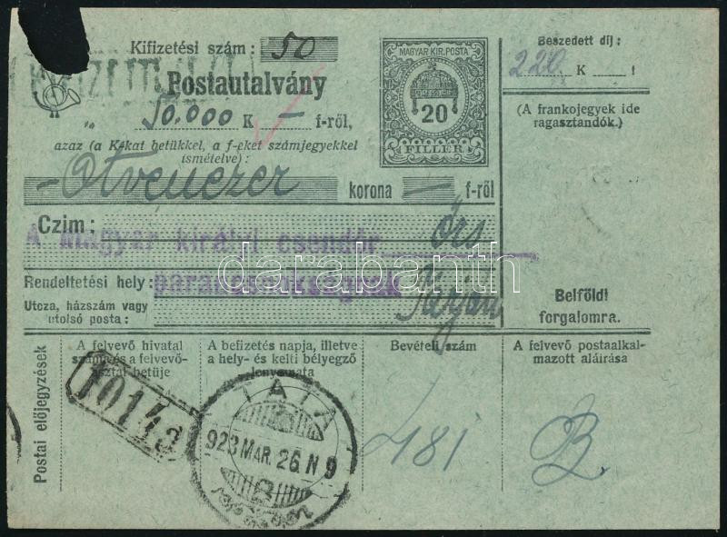1923 Tata, postautalvány 50.000 koronáról, a tarjáni m. kir. csendőrpa...