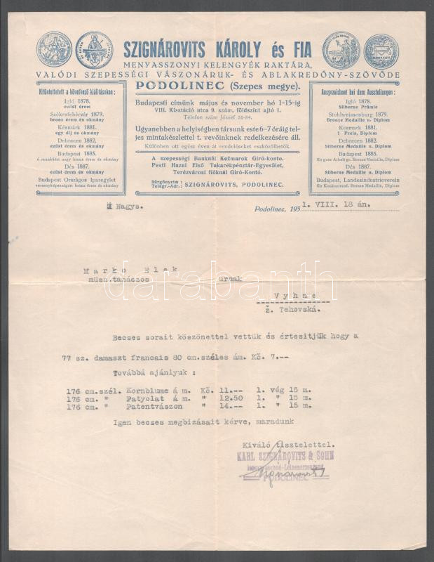 1931 Podolinec (Podolin), Szignárovits Károly és Fia menyasszonyi kele... https://www.darabanth.com/en/500-Online-auction/500.0/Art-and-other-collectibles/Documents~1000001/1931-Podolinec-Podolin-Szignarovits-Karoly-es-Fia-menyasszonyi-kelengyek-raktara-valodi~II3408123