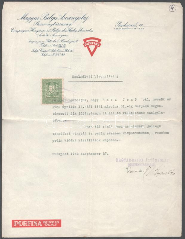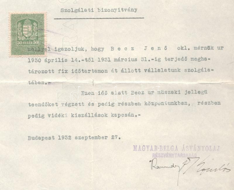 1932 Bp., Magyar-Belga Ásványolaj Rt. által kiállított szolgálati bizonyítvány, aláírásokkal, 50f okmánybélyeggel
