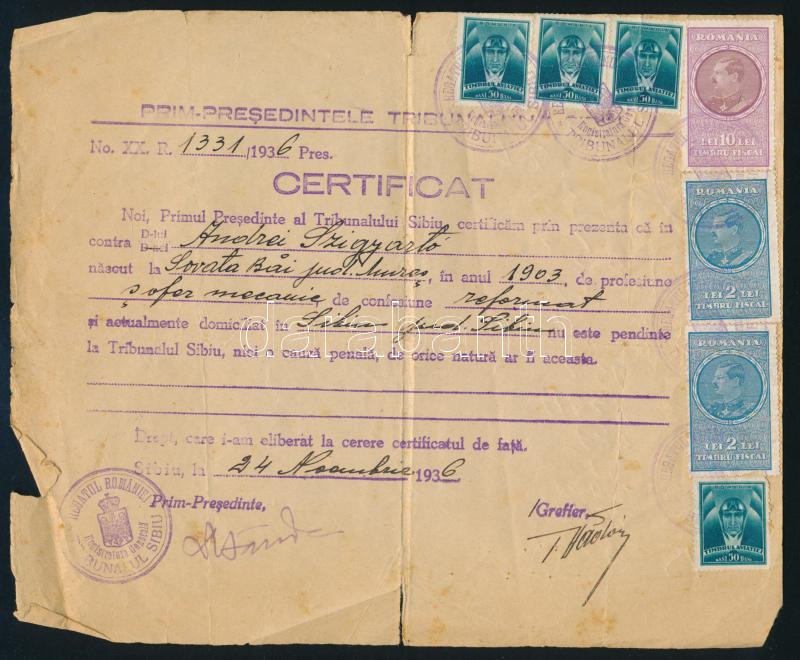 1936 Nagyszeben, román nyelvű igazolás 7 darab bélyeggel, szakadással, 17x21 cm