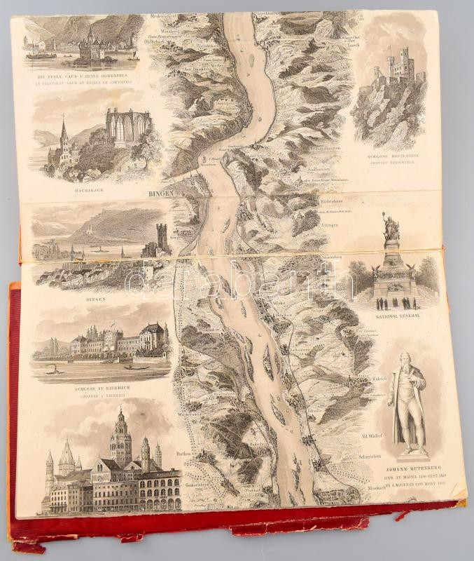 [A Rajna panorámaképe] Neues Panorama des Rheins von Mannheim bis Cöln. Mit 45 Randbildern nebst Beschreibung. Mainz. (1869) D. Kapp 246 x 29 cm Nagy méretű litográfia, hátoldalán megerÅ‘sÃtésekkel, szétvált félvászon kötésben