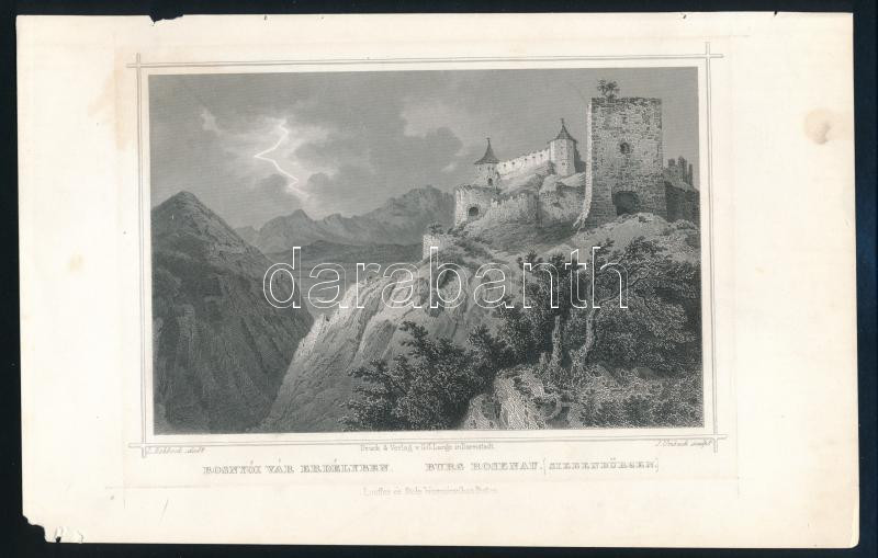 Description: Ludwig Rohbock (1820-1883) - Julius Umbach (1815-1877): Rosnyói vár Erdélyben (Rozsnyó, Barcarozsnyó) / Burg Rosenau (Siebenbürgen). Acélmetszet, papír, jelzett a metszeten, kisebb lapszéli sérülésekkel, 12x17 cm