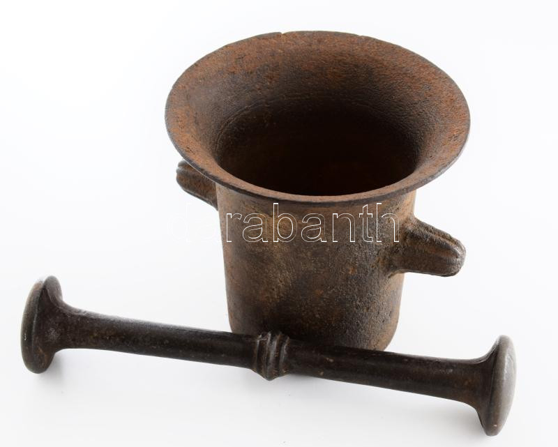 Antik vas mozsár, törővel, m: 11 cm, törő h: 20 cm