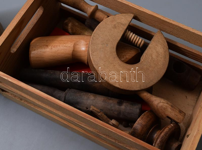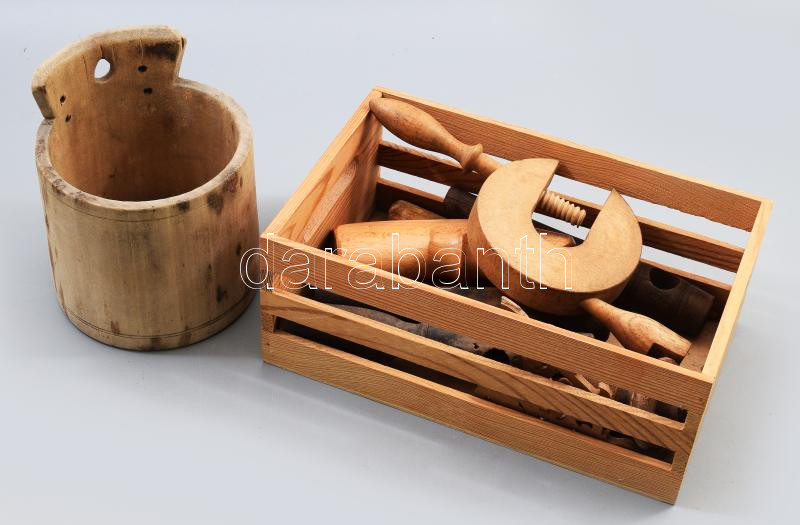 Kis fadoboznyi régi fatárgy tétel, közte szorító, hordócsapok, stb.