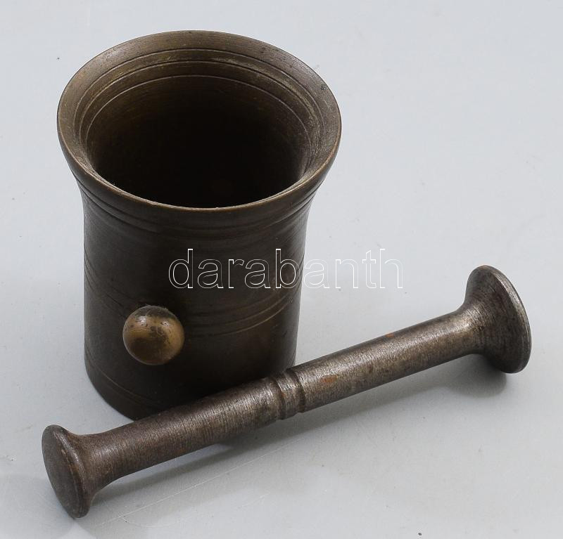 Régi bronz mozsár vas törővel, m: 9 cm, törő h: 14 cm