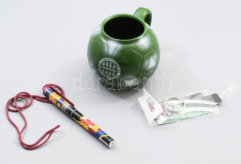 Sport relikviák: FTC bögre, tolltartó, Barcelona toll, Hannover kulcstartó