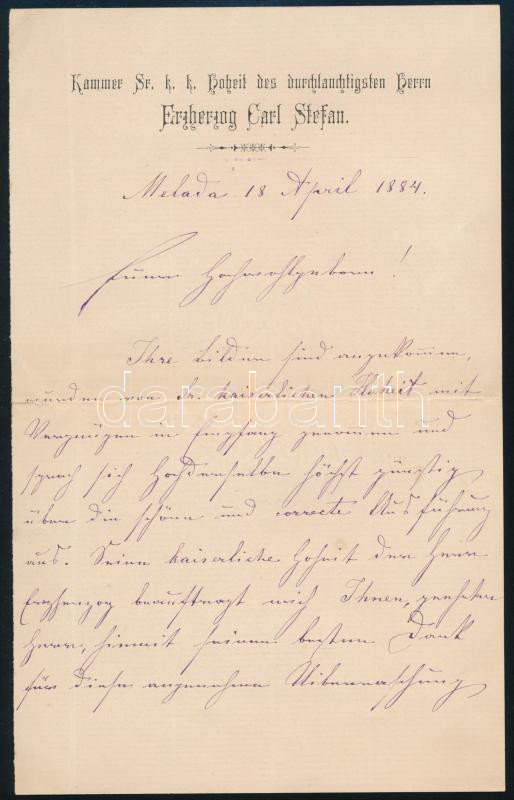 1884 Melada, Erzherzog Carl Stefan fejléces levél Egon Schorinsky aláí...