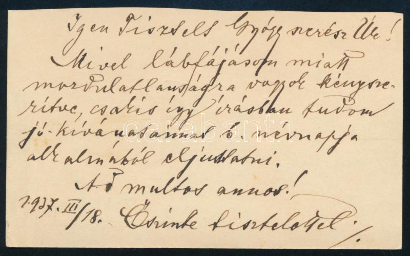 Description: 1937 Lipcsey Gyula (1879-1943) szilágysomlyói (Simleul-Silvaniei) plebános, pápai kamarás névjegykártyája, a hátoldalán autográf soraival, aláírása nélkül, benne névnapi jókívánságaival gyógyszerész részére, 6x10 cm.