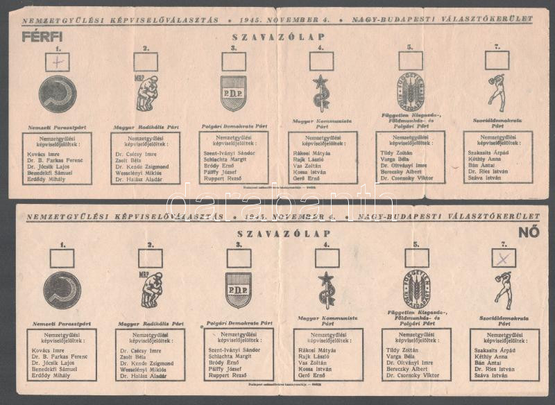 1945 Nemzetgyűlési Képviselőválasztás, Nagy-Budapesti választókerület, 1945. nov. 4., Férfi és Nő szavazólapok, a választható jelöltek között Schlachta Margit, Rákosi Mátyás, Rajk László, Vas Zoltán, Gerő Ernő, Tildy Zoltán, Szakasits Árpád, Kéthly Anna és mások.