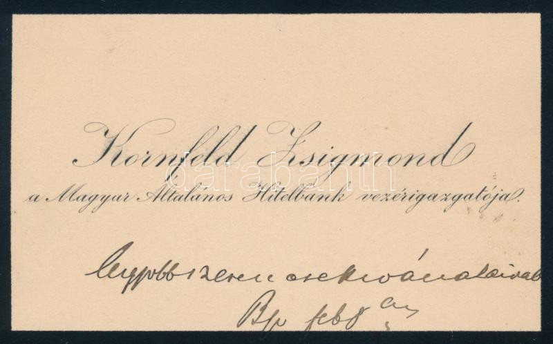 Description: cca 1890-1900 Kornfeld Zsigmond (1852-1909) Magyar Általános Hitelbank vezérigazgatójának, a monarchia legbefolyásosabb bankárának névjegykártyája, rajta autográf bejegyzéssel, 7x10 cm