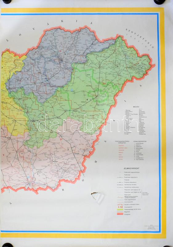 1967 Magyarország postajárati térképe, két részből álló, nagyméretű térkép, kiadja a Posta-vezérigazgatóság, Bp., Kartográfiai Vállalat, megjelent 3600 példányban, feltekerve, lapszéli gyűrődésekkel, 118x83 cm (x2)
