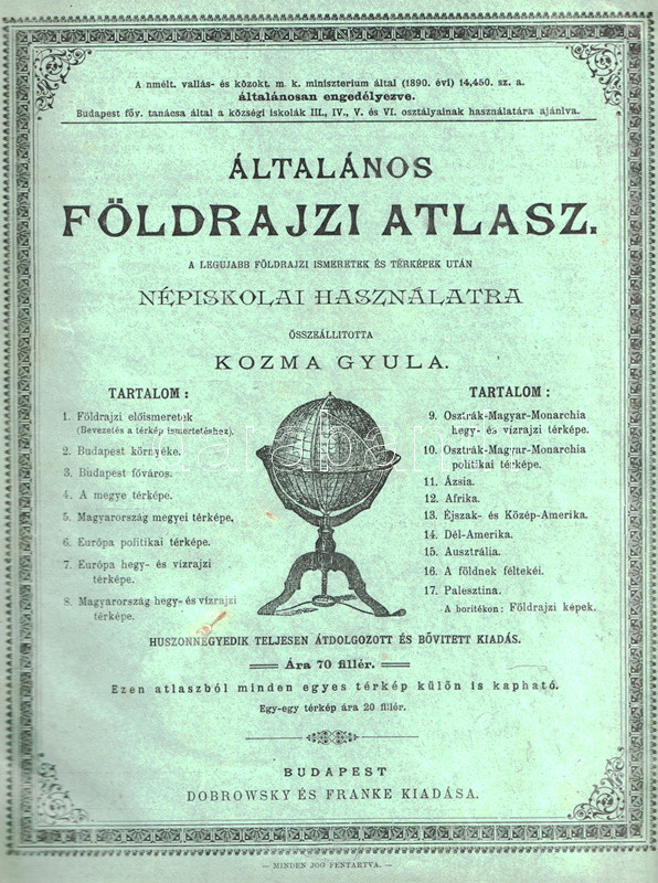 Kozma Gyula földrajzi író népiskolai atlasza először 1878-ban jelent meg, színes térképeket közlő atlaszunk a 24., átdolgozott kiadásból való, melyet a vallási és közoktatásügyi miniszter 1890. évi rendeletével engedélyezett, s melyet Budapest főváros tanácsa a községi iskolák III-VI. osztálya számára ajánlott.