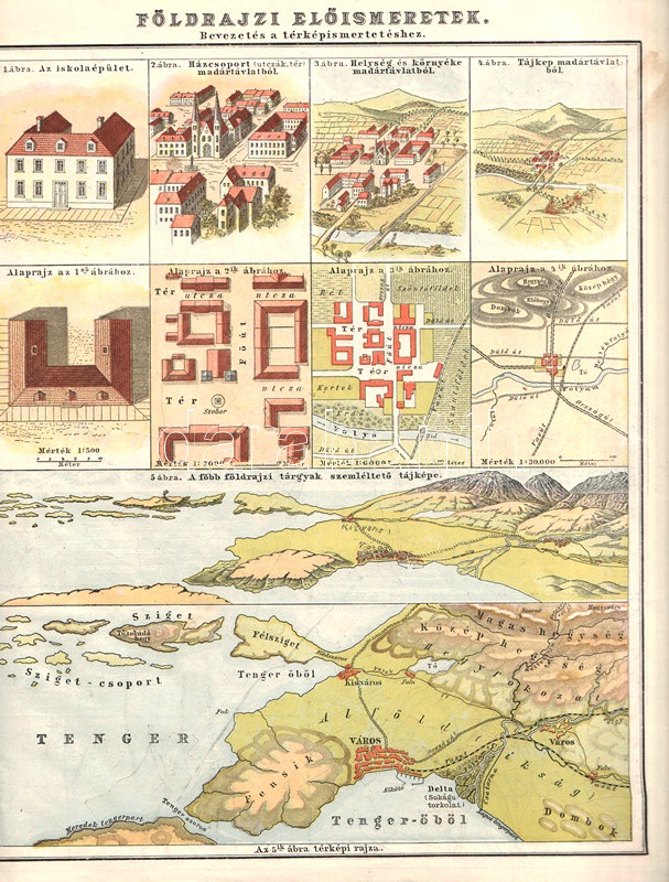 Elemi iskolai atlaszunk élén térképolvasási gyorstalpaló: az osztályterem, a háztömb, a helység és a környék egymás alá helyezett alaprajzaival és madártávlati rajzaival, ahogyan ez azóta is szokásos az általános iskolai földrajzoktatásban. A különféle térképészeti fogalmakat alaprajzban és madártávlatban bemutató színes fantáziarajz nyitóoldali közlése szemlátomást szintén a földrajzoktatási hagyomány elmaradhatatlan része.