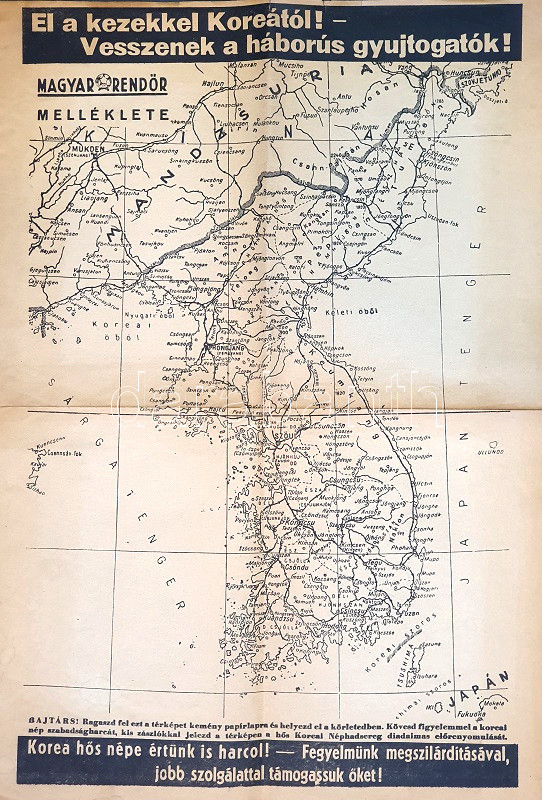 Propagandacélokat szolgáló Korea-térképünk az 1950-1953 közötti koreai háború iránti hazai sajtófigyelem dokumentuma. A rendÅ‘ri állomány használatára készült térképünk szöveges utasÃtása a következÅ‘: "Bajtárs! Ragaszd fel ezt a térképet kemény papÃrlapra, és helyezd el a körletedben. Kövesd figyelemmel a koreai nép szabadságharcát, kis zászlókkal jelezd a térképen a hÅ‘s Koreai Néphadsereg diadalmas elÅ‘renyomulását. Korea hÅ‘s népe értünk is harcol! Fegyelmünk megszilárdÃtásával, jobb szolgálattal támogassuk Å‘ket!"