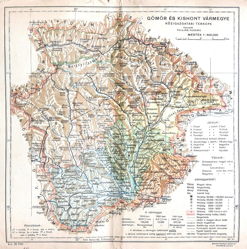 [Térkép] Gömör és Kishont vármegye közigazgatási térképe (az I. bécsi döntést követően). Tervezte: Tallián Ferenc. Mérték: 1:400,000. (1942).