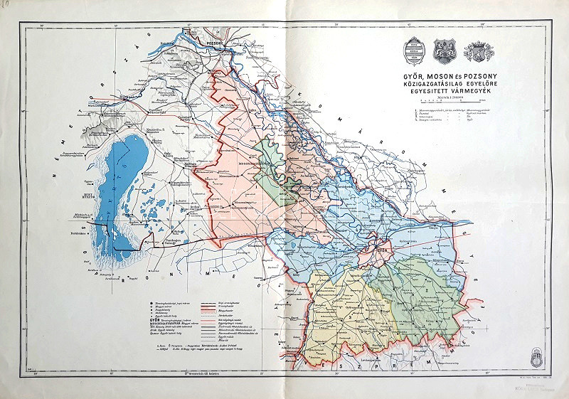 Domborzati és vÃzrajzi részleteket is feltüntetÅ‘ térképünk a M. kir. Honvéd Térképészeti Intézet 1937-1941 között készült közigazgatási térképsorozatának tagja. Megyénk 1923-ban alakult a három megye Trianon után Magyarországon maradt darabjaiból. Jóllehet az ország területe a Duna másik oldalán az 1938. évi elsÅ‘ bécsi döntéssel megnövekedett, e döntÅ‘en magyarok lakta részt Komárom megyéhez csatolták, a közigazgatási átszervezés Ãgy GyÅ‘r-Moson-Pozsony megyét nem érintette.