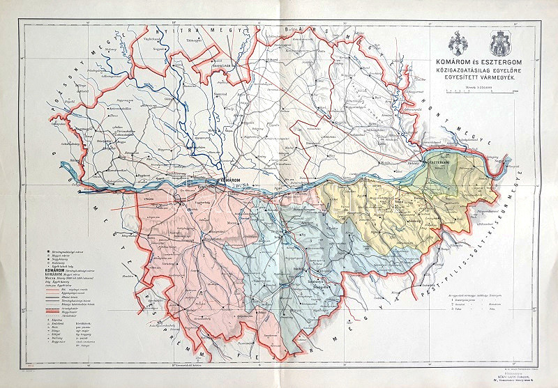 [Térkép] Komárom és Esztergom közigazgatásilag egyelőre egyesített vármegyék térképe. Mérték: 1:250,000. (1937).