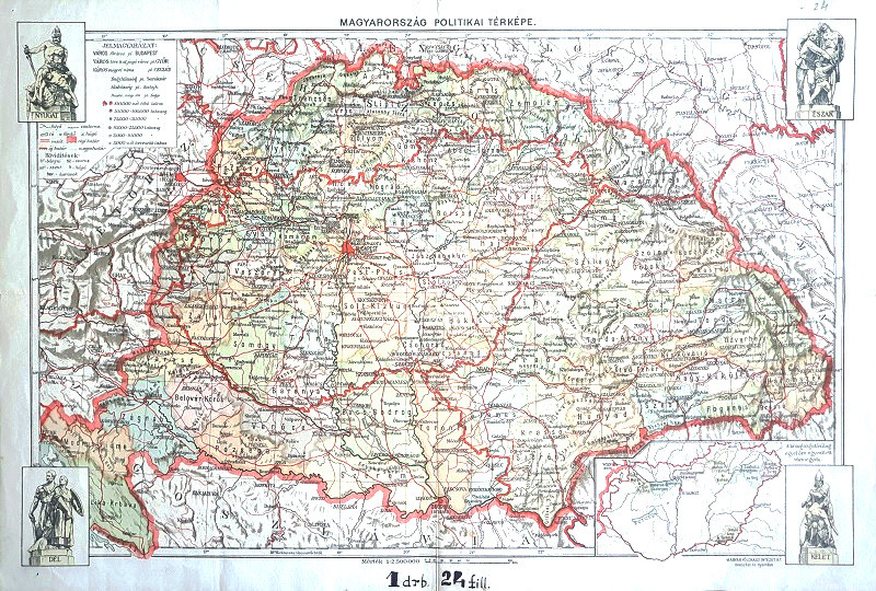 Színes politikai térképünk a történelmi Magyarország határain belül az 1938. november 2-i első bécsi döntést követő új, a Felvidék magyar lakta területeivel bővült, Komáromot, Losoncot, Rimaszombatot és Rozsnyót, Kassát, Ungvárt és Munkácsot is magában foglaló országhatárokat ábrázolja. Évszámadat nélkül kiadott lapunk kiadási idejének megállapításához fontos adat, hogy dokumentumunk északi szomszédunkként Csehszlovákiát nevezi meg, így az még az 1939 márciusa előtti időre utal, a Csehország német megszállása, az önálló Szlovákia kikiáltása és magyar részről a kárpátaljai bevonulás előtti időpillanatra. Domborzati, vízrajzi, közlekedési, településhálózati és közigazgatási részletekben bővelkedő térképünk jobb alsó sarkában a közigazgatásilag egyelőre egyesített vármegyéket feltüntető melléktérkép, négy sarkában a négy égtájat feltüntető budapesti irredenta szobrok grafikájával (Észak, Kelet, Dél, Nyugat).