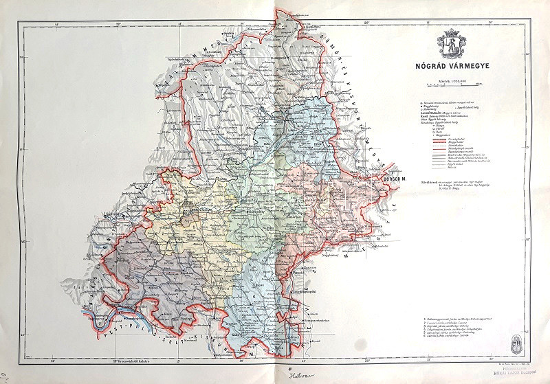 Domborzati és vízrajzi részleteket is feltüntető térképünk a M. kir. Honvéd Térképészeti Intézet 1937-1941 között készült közigazgatási térképsorozatának tagja. Az ország északi határa menti hegyvidéki megyénk területe az I. bécsi döntés nyomán erősen kibővült. A megye történelmi területét ábrázoló térképünkön az egykori megye bő háromnegyede már az anyaországhoz tartozik, a határon belüli területek járásonként elkülönülő színkódolással szerepelnek, a szlovák oldal járásbeosztása jelöletlen. Megyénk a Börzsöny keleti felét is birtokolja, Nógrádverőcénél dunai kijárattal, a Börzsöny nyugati felét azonban átadta a bécsi döntés nyomán felálló új közigazgatási egységnek, a Léva székhellyel kialakított Bars és Hont megyének.