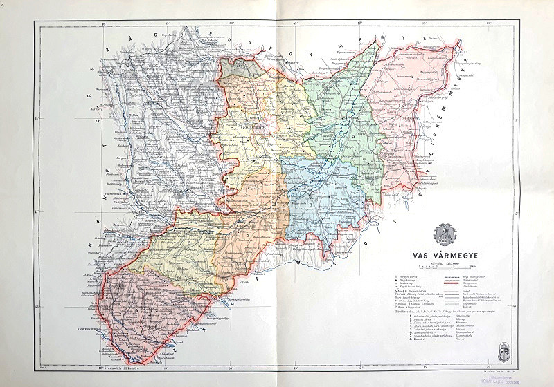 Domborzati és vízrajzi részleteket is feltüntető térképünk a M. kir. Honvéd Térképészeti Intézet 1937-1941 között készült közigazgatási térképsorozatának tagja. Megyénk a trianoni döntés után elvesztette muraszombati, németújvári, felsőőri járását és kőszegi járásának nagyobbik felét, e területeken a Szerb-Horvát-Szlovén Királyság és Ausztria osztozott meg. A megye az 1941. év áprilisi muravidéki bevonulással visszanyerte muraszombati járását, illetve szentgotthárdi járása is kiegészült az Őrség nyugati területeivel.
