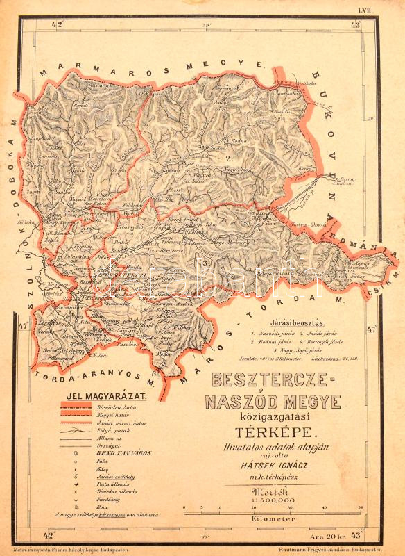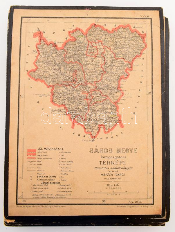 cca 1880-1890 Magyar megyék közigazgatási térképei: 33 db Esztergom, Sáros, Győr, Nagy-Küküllő, Beszterce-Naszód, Szolnok-Doboka, Ugocsa, Fejér, Turócz, Árva, Sopron, Heves, Borsod, Liptó, Zolyom, Gömör-Kishont, Torna, Ung, Udvarhely, Abauj, Moson, Alsó-Fehér, Bereg, Hont, Nógrád Fogaras, Tolna, Komárom, Háromszék, Szepes, BRassó, Szeben, , rajzolta: Hátsek Ignác, 1 : 500.000, Bp., Rautmann Frigyes kiadása (Posner Károly Lajos-ny.), kartonra nyomva min, néhány kis lapszéli sérüléssel, 35x26 cm