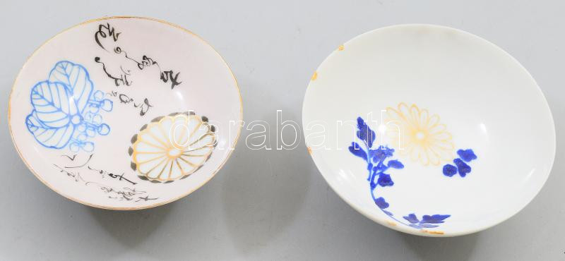 2 darab japán porcelán katonai szakés csésze. cca 1940-1944, klf motívumokkal és kalligráfiával díszítve, sérüléssel, d: 8,5-9 cm