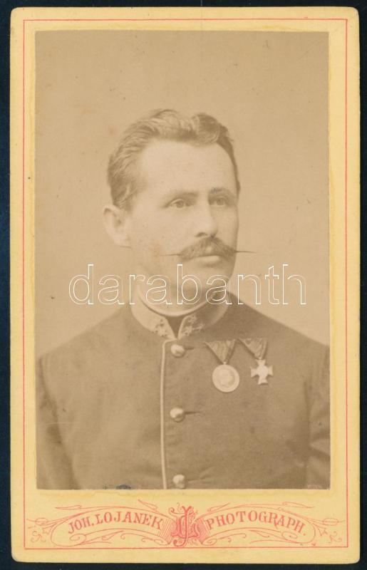 Description: cca 1870 Katonatiszt kitüntetésekkel, vizitkártya Lojanek János nagyváradi (Grosswardein, Oradea) műterméből, a hátoldalon autográf dedikációval, 10,5x6,5 cm