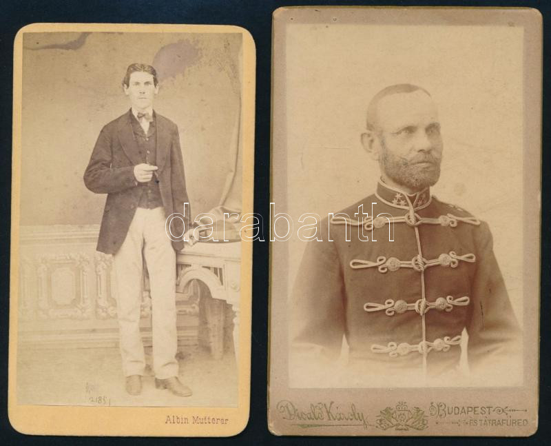 Description: cca 1880-1890 Vegyes fotó tétel, 2 db, közte egy katonaportréval Divald Károly budapesti műterméből, valamint egy férfiportréval Albin Mutterer bécsi műterméből, az utóbbi foltos, 11x7 cm és 10x6 cm