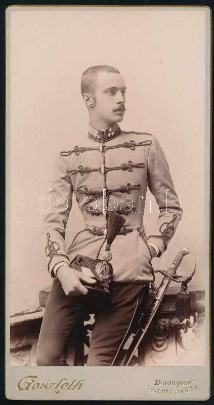 Description: cca 1900-1910 10. császári és királyi fehérvári huszárezred fiatal huszárkadét portréja, keményhátú fotó Goszleth István budapesti műterméből, 20,5x11 cm