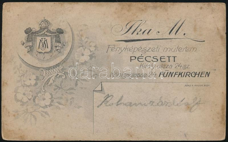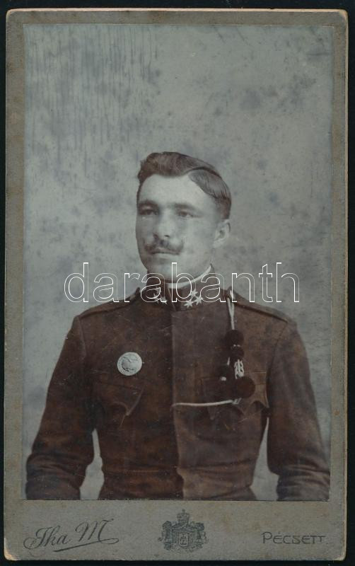 cca 1910-1915 Katonatiszt lövészbojttal, távbecslő ügyességi jelvénnyel, vizitkártya Ika M. pécsi műterméből, kissé foltos, 10,5x6,5 cm