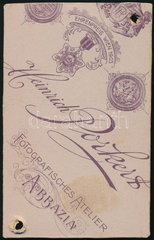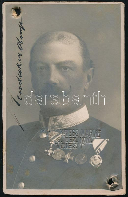 cca 1910 Az Osztrák-Magyar Cs. és Kir. Haditengerészet (K. u. k. Kriegsmarine) magas rangú tisztjének portréja, kitüntetésekkel (Katonai Érdemkereszt, Tiszti Szolgálati Jel, Katonai Jubileumi Kereszt, stb.), keményhátú fotó Heinrich Porkert (Abbázia) műterméből, "K.u.K. KRIEGS MARINE FRG. BEZ. KOM. TRIEST" feliratú hidegpecséttel, lyukasztással, körbevágva, 10,5x6,5 cm