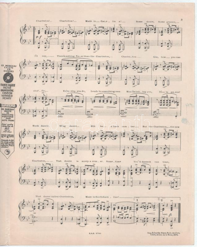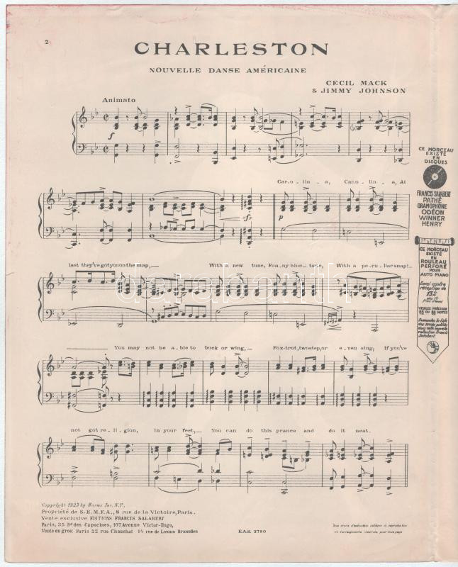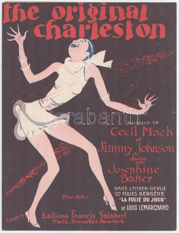 cca 1923-1925 Cecil Mack - Jimmy Johnson: The Original Charleston. Musique de Cecil Mack et Jimmy Johnson dansé par Josephine Baker. Dan l'Hyper-Revue des Folies Bergére "La Folie du Jour" de Louis Lemarchand. A színes borítón a táncoló Josephine Bakerrel. Paris, Francis Salabert, francia és angol nyelven, a borító jelzett a dúcon (R. de Valerie), 3 sztl. lev., egészen apró szakadásokkal, 35x27 cm.