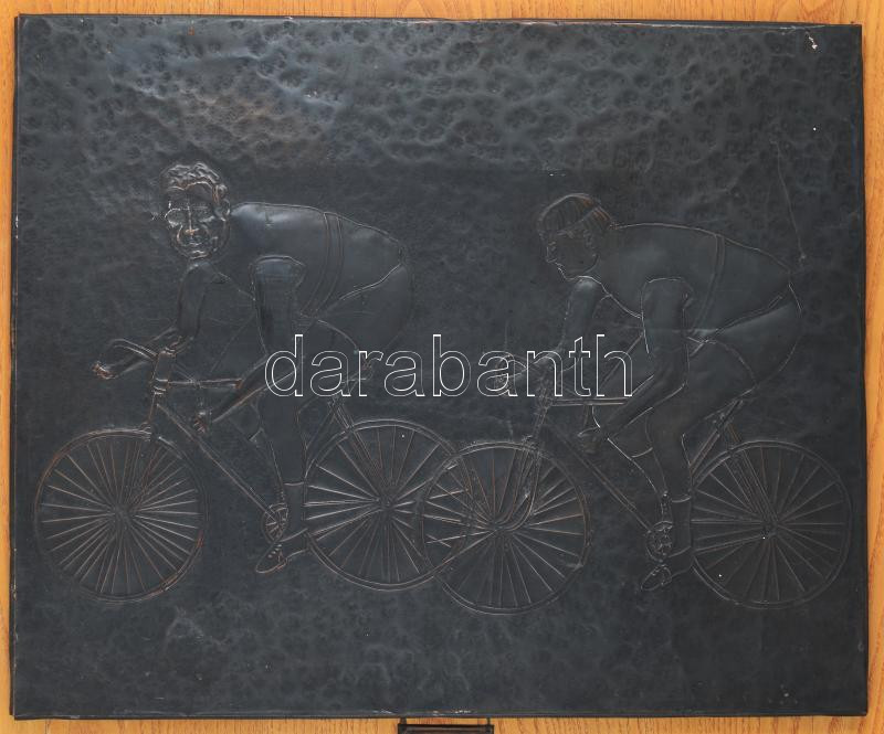 Ismeretlen művész: Biciklizők. Rézlemez kép, fa lapon, 45x55 cm, 70x60...