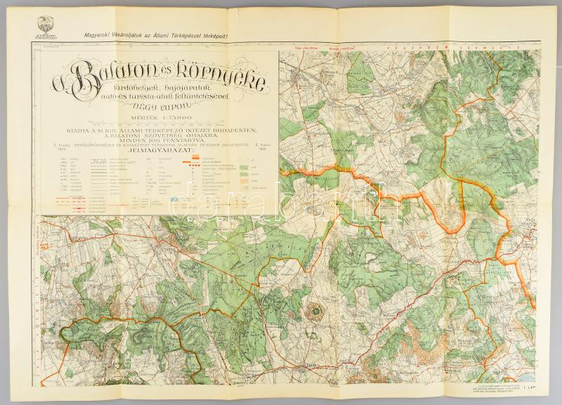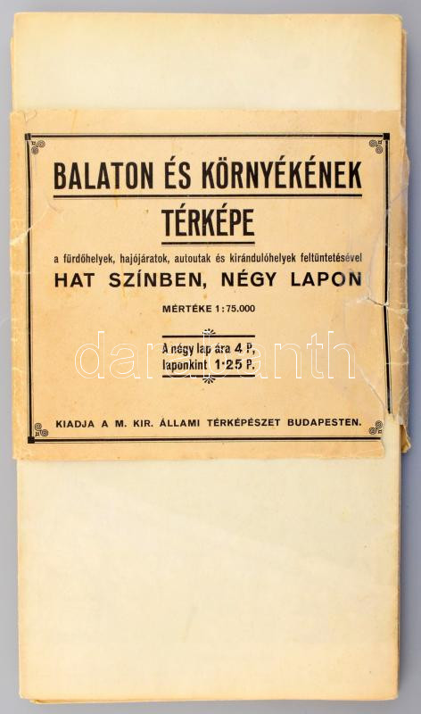 cca 1929 Balaton és környéke térkép, 4 lap, 1:75 000, Bp., M. Kir. Térképező Intézet, 2. kiadás, rajta a Balatonhoz vezető vasutak vázlatos térképével is, eredeti kissé sérült szalaggal, jó állapotban, 44x61 cm