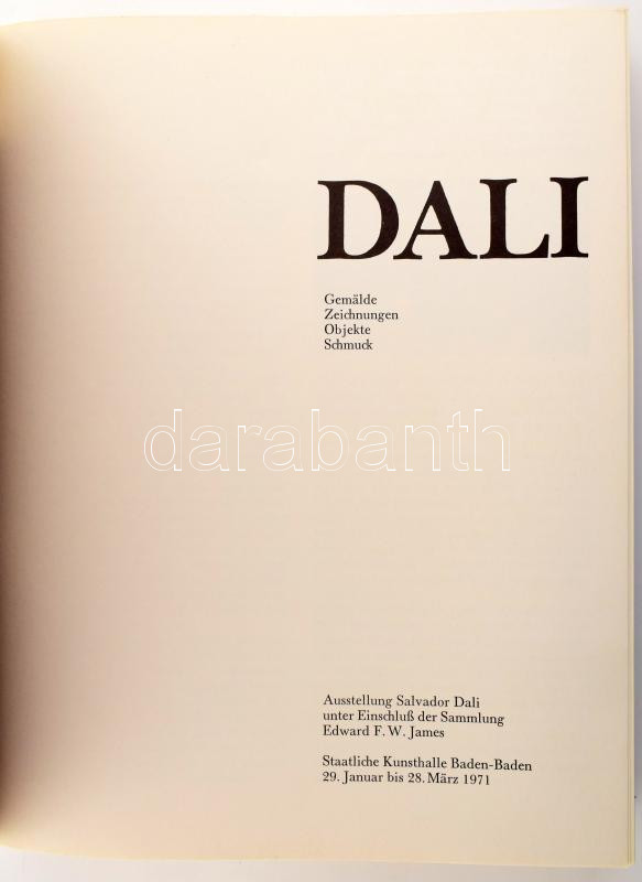 Description: Dali. Gemälde, Zeichnungen, Objekte, Schmuck. Ausstellung Salvador Dali unter Einschluß der Sammlung Edward F. W. James. Baden - Baden, 1971, Staatliche Kunsthalle. Német nyelven. Gazdag képanyaggal illusztrált. Kiadói papírkötés, kissé kopott borítóval.