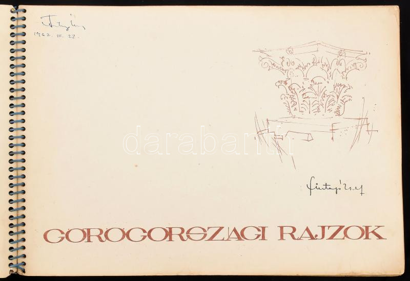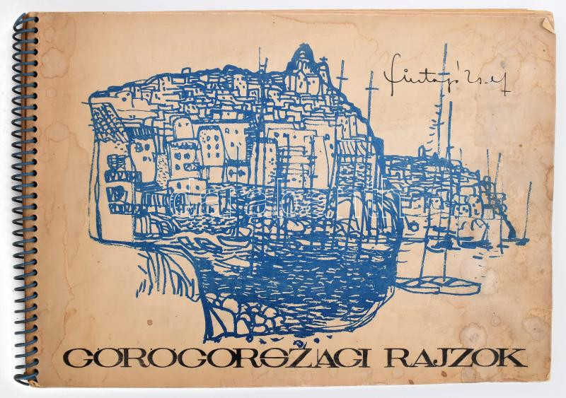 Finta József: Görögországi rajzok. A művész, Finta József (1935-2024) Kossuth-, kétszeres Ybl Miklós- és Prima Primissima díjas építész által ALÁÍRT és dátumozott példány (1962. III. 22.)! [Bp.], 1962,ÉM Lakóépülettervező Vállalat, 21 sztl. lev.+19 t. 20,5x29,5 cm. Kiadói haránt-alakú spirál-kötés, foltos. Megjelent 300 példányban! Ritka!