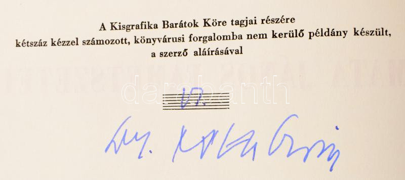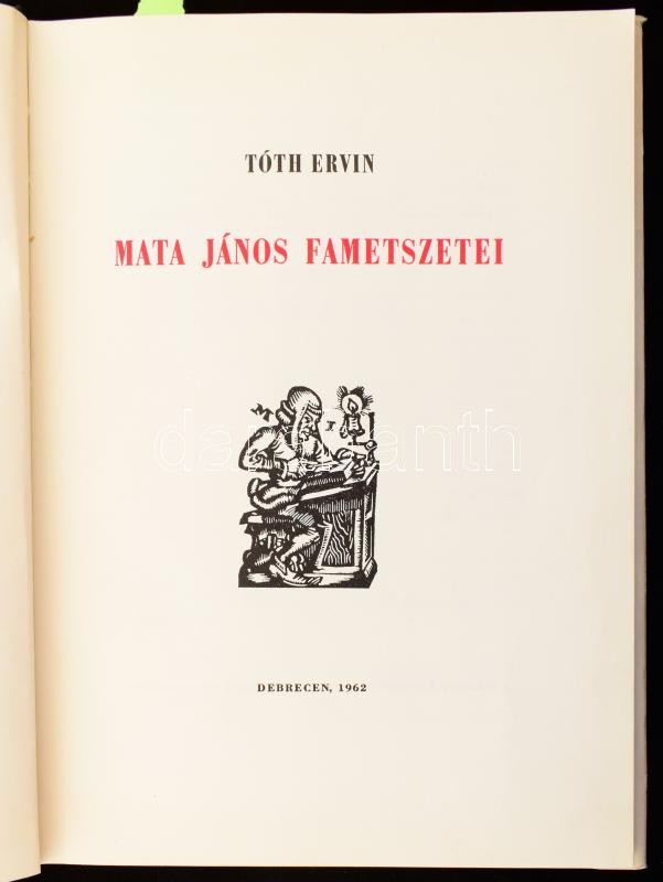 Tóth Ervin: Mata János fametszetei. Számozott példány. Mata János fametszeteivel. Debrecen, 1962, Tudományos IsmeretterjesztÅ‘ Társulat Hajdú-Bihar megyei szervezete, 25+3 p.+32 t. Kiadói félvászon-kötésben, kiadói illusztrált papÃr védÅ‘borÃtóban. Dedikált, aláÃrt, számozott