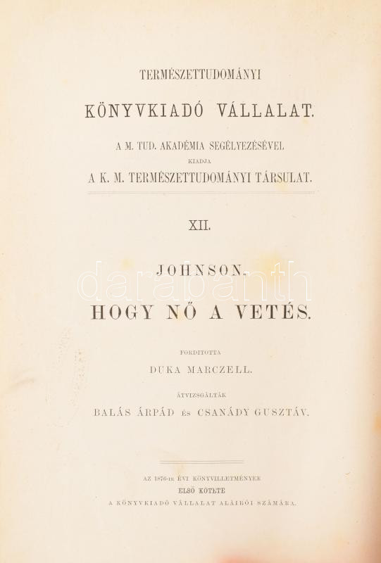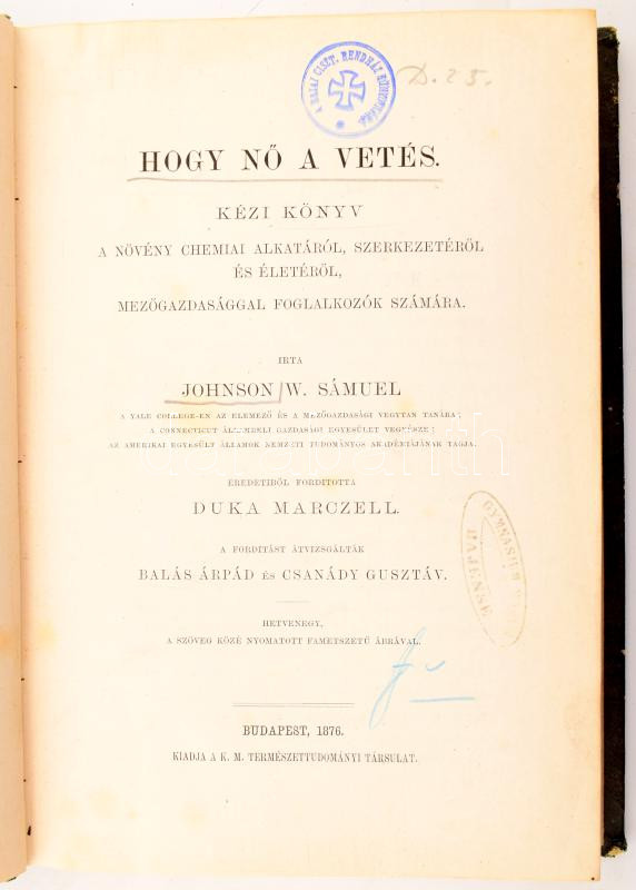 [Johnson, William Samuel] Johnson W. Sámuel: Hogy nő a vetés. Kézi könyv a növény chemiai alkatáról, szerkezetéről és életéről, mezőgazdasággal foglalkozók számára. Ford.: Duka Marcell. Hetvenegy, a szöveg közé nyomtatott fametszetű ábrával. A Természettudományi Könyvkiadó Vállalat XII. kötete. Bp., 1876, K. M. Természettudományi Társulat, XXVII+404 p. Korabeli átkötött félvászon-kötésben, kopott borítóval és gerinccel, a borítón címkével, a címlapon bélyegzésekkel.