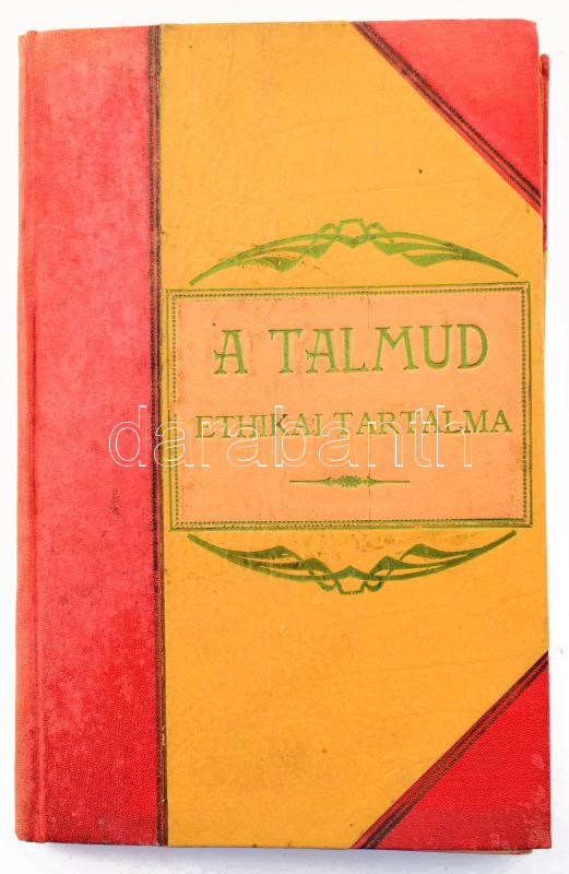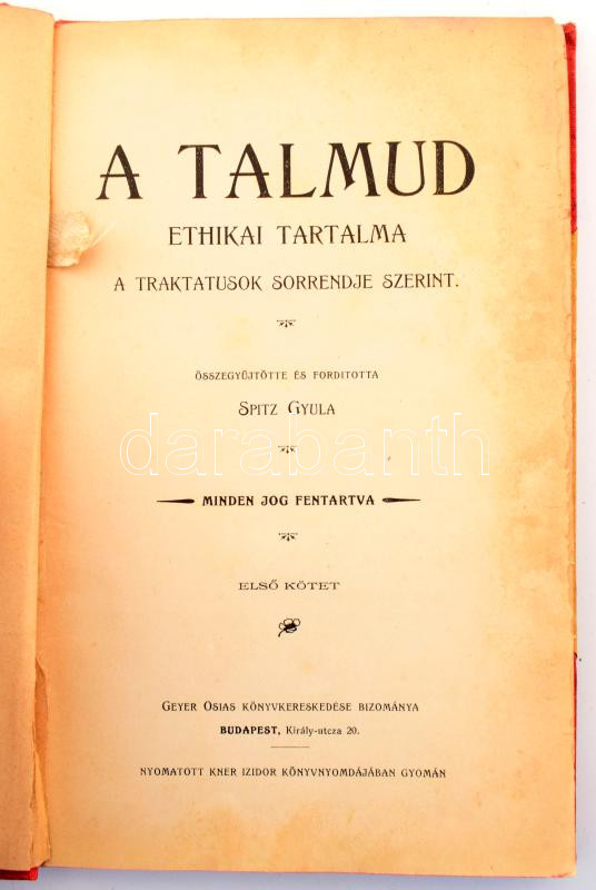 Spitz Gyula: A talmud ethikai tartalma a traktusok sorrendje szerint. Összegyűjtötte és ford. - -. Első kötet. Unicus, több kötete nem jelent meg! Bp.,[1905],Geyer Osias, (Gyoma, Kner Izidor-ny.), 80 p. Korabeli szecessziós félvászon-kötésben, kopott, foltos borítóval. Ritka!