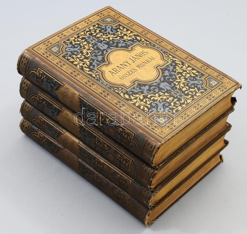 Arany János összes munkái 4 kötete (I.,X.XI.,XII.) Bp., 1900,Franklin. Kiadói aranyozott, festett egészvászon-kötések, aranyozott lapélekkel, kopott borÃtókkal, az I. kötetbÅ‘l az elülsÅ‘ elÅ‘zéklap kijár.