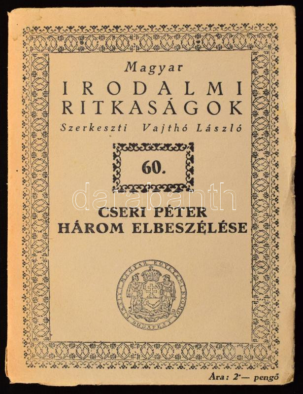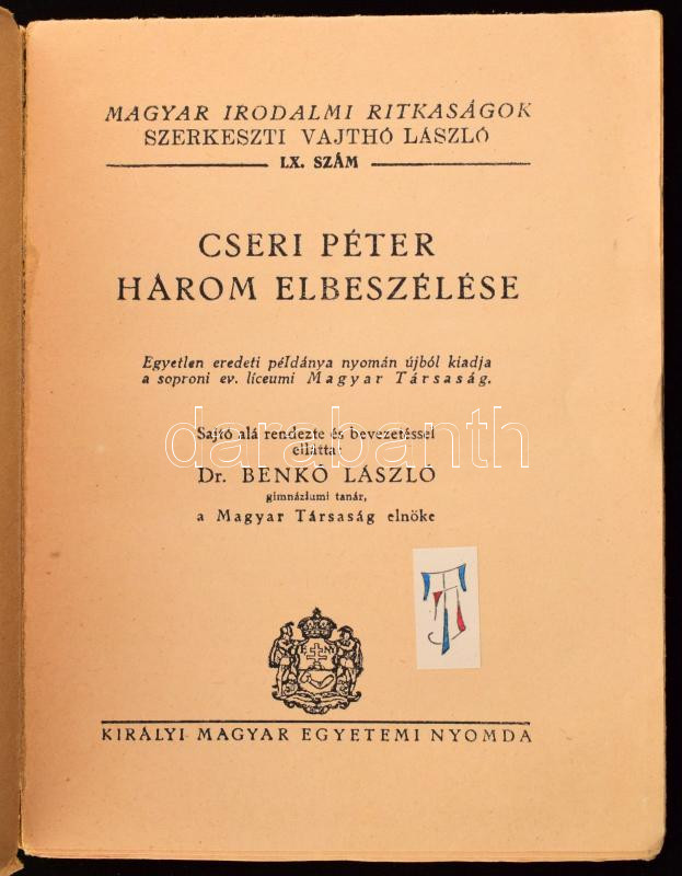 Description: Cseri Péter három elbeszélése. Sajtó alá rendezte és bevezetéssel ellátta: Dr. Benkő László. Magyar Irodalmi Ritkaságok LX. Szerk.: Vajthó László. Bp.,[1942.],Kir. M. Egyetemi Nyomda, 113+3 p. Kiadói papírkötés, a borítón kis szakadással.