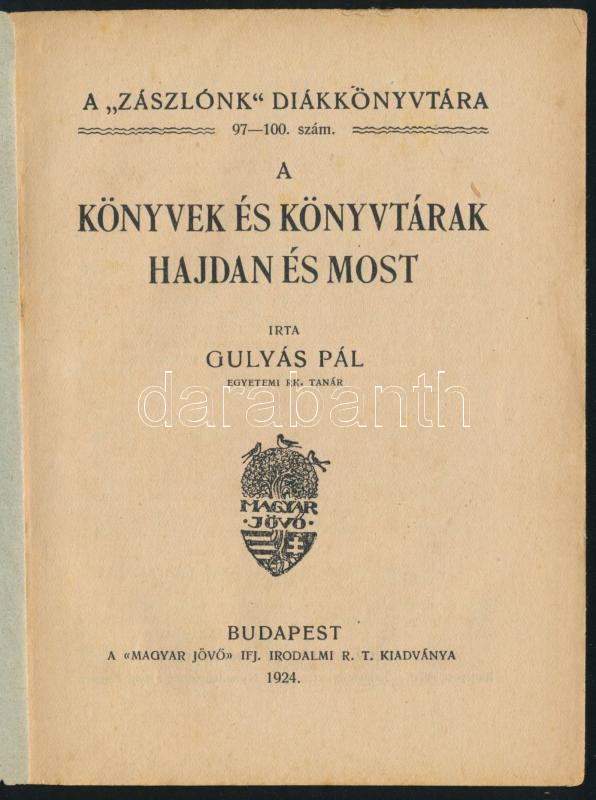 Gulyás Pál: A könyvek és könyvtárak hajdan és most. A ,,Zászlónk"... https://www.darabanth.com/en/500-Online-auction/500.0/Books/Books-Other-rarities~2500135/Gulyas-Pal-A-konyvek-es-konyvtarak-hajdan-es-most-A-Zaszlonk-Diakkonyvtara-97-100-~II3403404