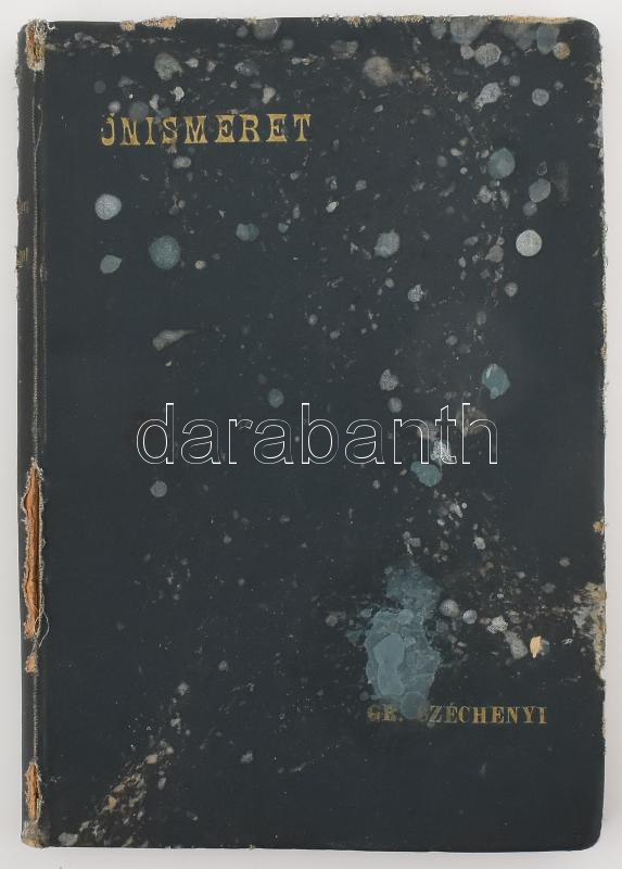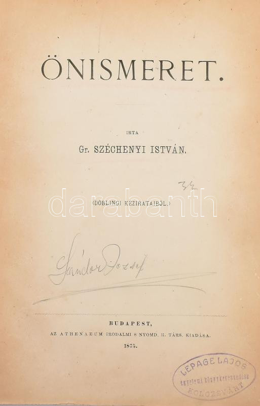 Széchenyi István, gr(óf): Önismeret. (Döblingi kézirataiból.) Bp., 1875, Athenaeum,4+252p. Első kiadás! Aranyozott egészvászon-kötés, márványozott lapélekkel, kopott, foltos borítóval, a borítón és a gerincen sérülésekkel, de belül jó állapotban, "Lepage Lajos Egyetemi Könyvkereskedése Kolozsvárt" bélyegzéssel a címlapon.