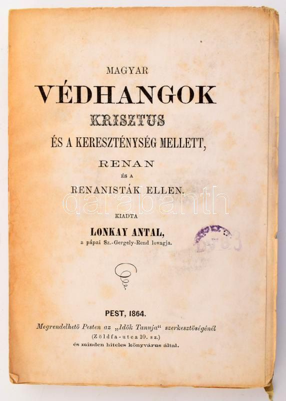 Description: Lonkay Antal: Magyar védhangok Krisztus és a kereszténység mellett, Renan és a renanisták ellen. Pest, 1864. (Vodiáner F.) VIII, 295 p. hiányos papírkötés, szétesett állapot, folt.