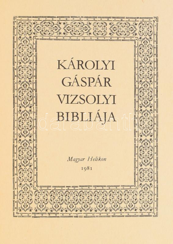 Vizsolyi Biblia. I-II. köt. Bp., 1981, Magyar Helikon. Hasonmás kiadás, kÃsérÅ‘füzettel (Szántó Tibor: Károlyi Gáspár Vizsolyi Bibliája). Kiadói aranyozott, bordázott gerincű műbÅ‘r-kötés, a borÃtók sarkán minimális kopással