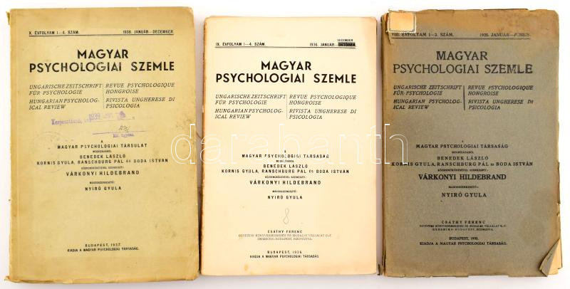 1935-1938 Magyar Psychologiai Szemle VIII. évf. 1-2. sz. + IX. évf. 1-4. sz. + X. évf. 1-4. sz. (3 kötet). Szerk.: Várkonyi Hildebrand, NyÃrÅ‘ Gyula. Bp., 1935-1937, Magyar Psychologiai Társaság. Kiadói papÃrkötés, változó állapotban, sérült, szétváló fűzéssel, egy hiányzó borÃtóval.